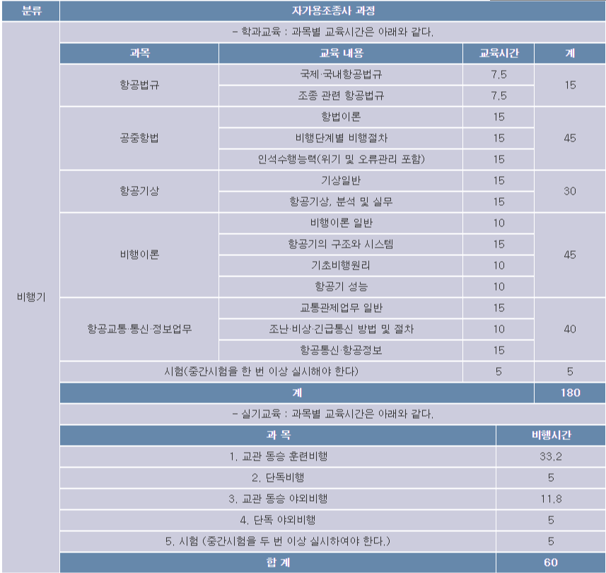 애초에 자격 요건에 40시간 이상의 비행경력과 교관이 동승하지 않은 10시간의 단독 비행경력을 쌓은 뒤 응시할 수 있다고 한다. 교육기간은 대략 4~6개월. 다만 직장과 병행한다면 기간은 훨씬 길어질 수 있다....