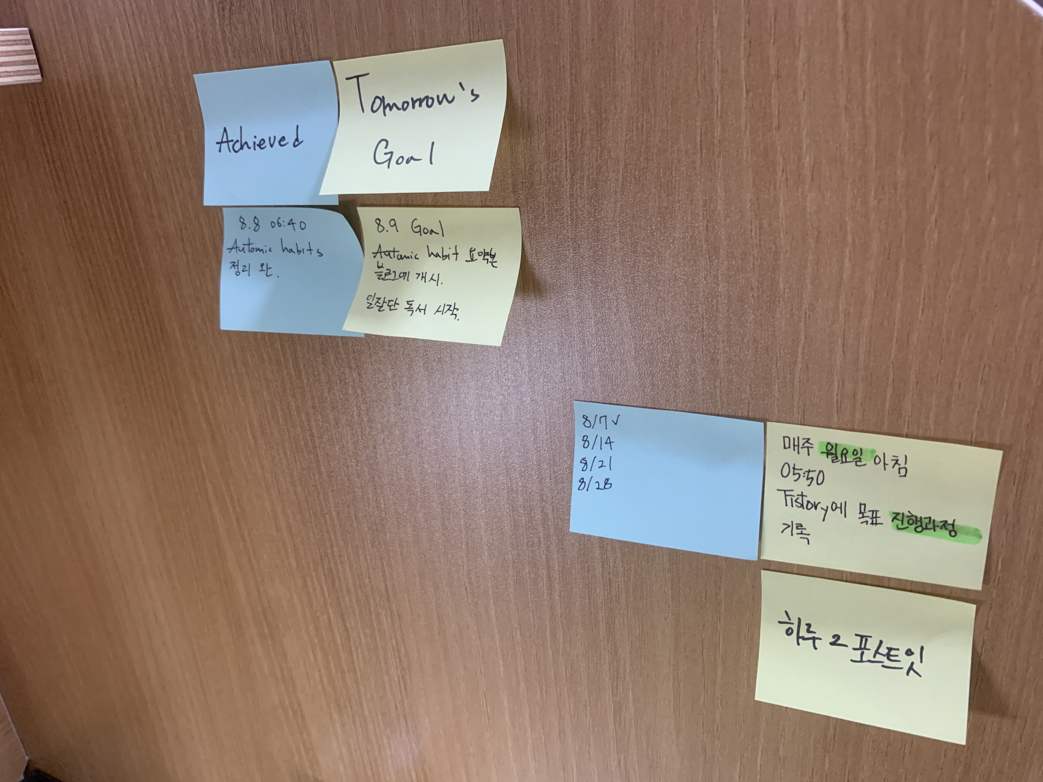 습관 추적 : 한 가지 습관을 달성하면 눈에 보이는 방법으로 흔적을 남긴다. -> 목표를 달성하면 포스트잇을 붙인다.